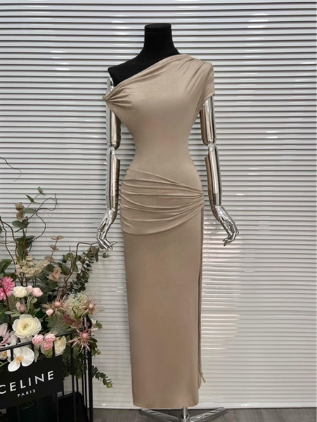 Đầm body lệch vai nhúng eo Nâu – Cái