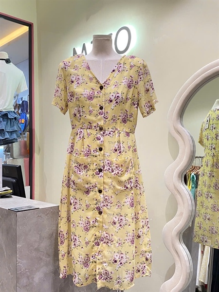 Đầm hoa vàng nút gỗ phối túi S – M