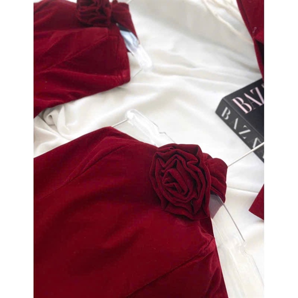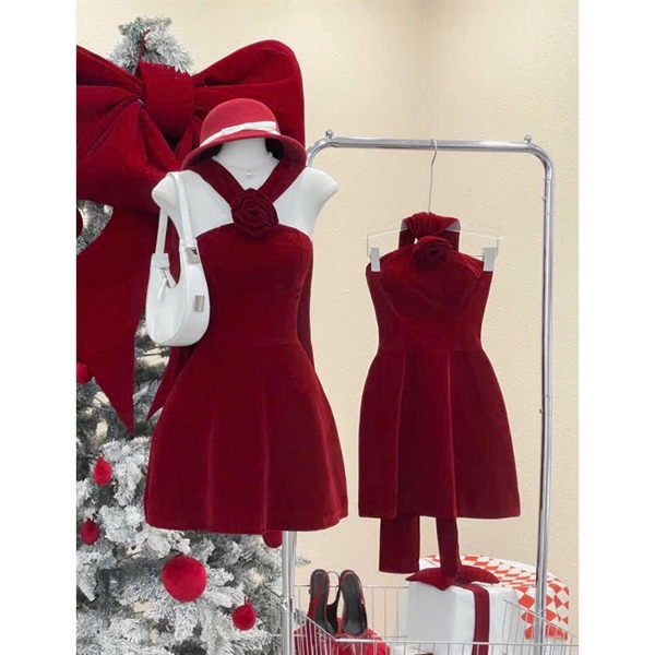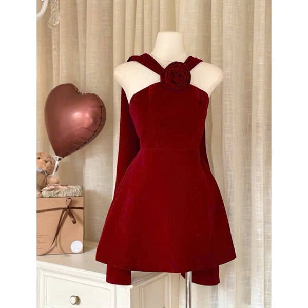Đầm nhung đỏ yếm hoa