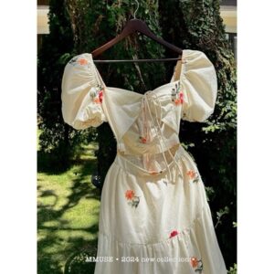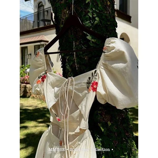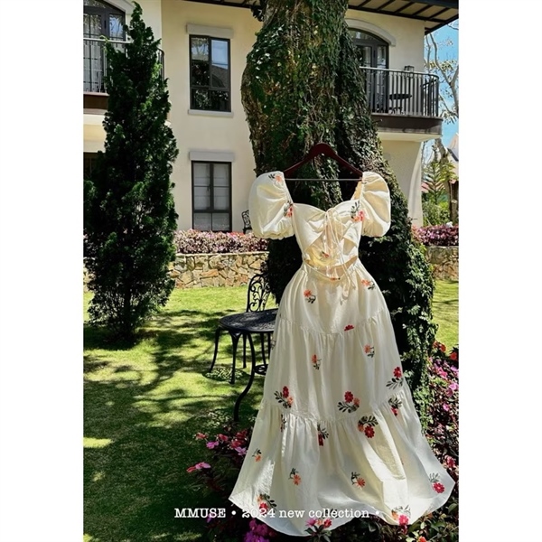 Đầm xô hoa thêu đỏ rút dây ngực TK